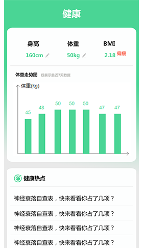 通过你的运动数据,身高体重等数据,为你计算出你的健康程度以及对你的体重进行7天监测