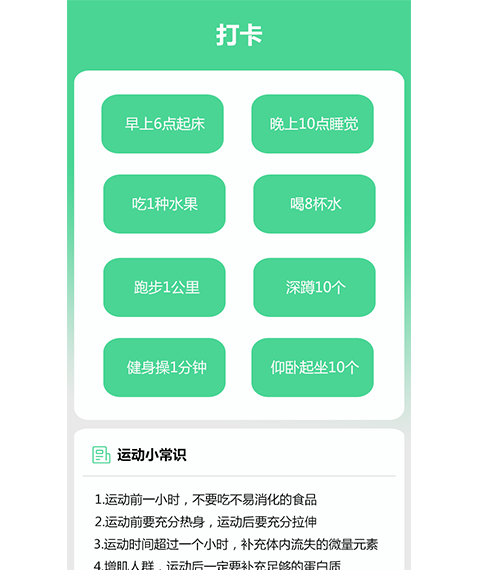 每日运动项目一目了然,好的作息和运动规律才能保持好的身材,为你好身材保驾护航